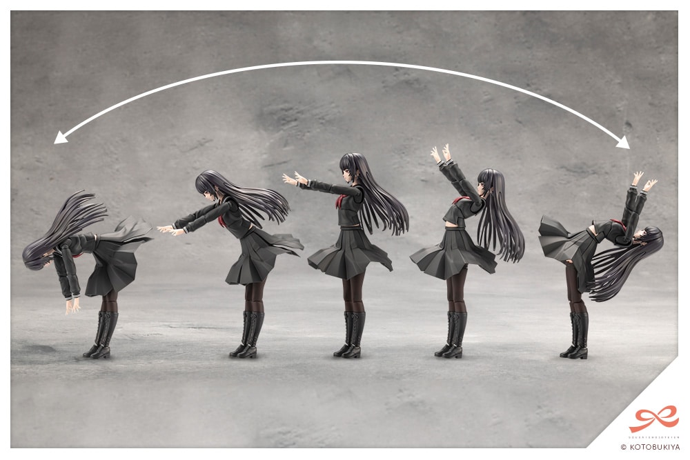 Using joints and features such as extendable shoulders, a chest and stomach that can twist in all directions, an adjustable skirt, and double-jointed elbows and knees, dynamic action poses can be created, like standing firm with a sword gripped with both hands, unsheathing the sword, and kneeling.
