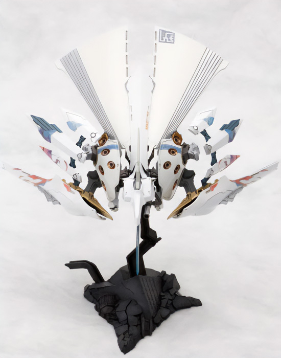 As this kit was designed to be geared towards advanced modelers, it includes more details and complexities in the sculpt that would otherwise be omitted in a typical kit, allowing for a faithful recreation. The small wings can be deployed or retracted by swapping out parts, and the landing arm can also be recreated through the replacement of parts. The patterns on the fuselage are recreated using mold shape and decals.
