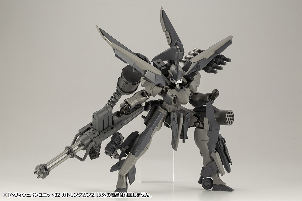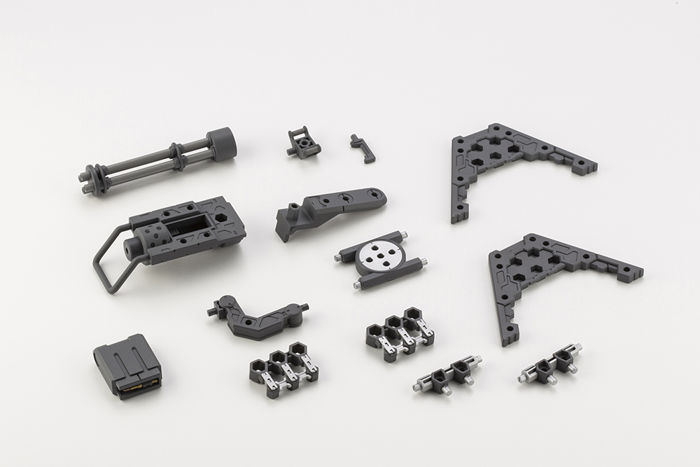 Introducing a new model of gatling gun that is compatible with Frame Arms and HEXA GEAR. This Weapon Unit can be used as a handheld weapon and, by using the base parts, with the 1/24 scale Governors in the HEXA GEAR series. This unit is compatible with the separately sold Weapon Unit 30 Belt Links to enhance overall firepower. Three sets can be linked together to create Triple Gatling Mode.