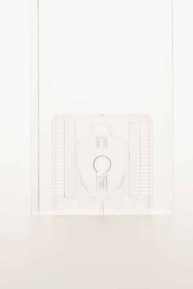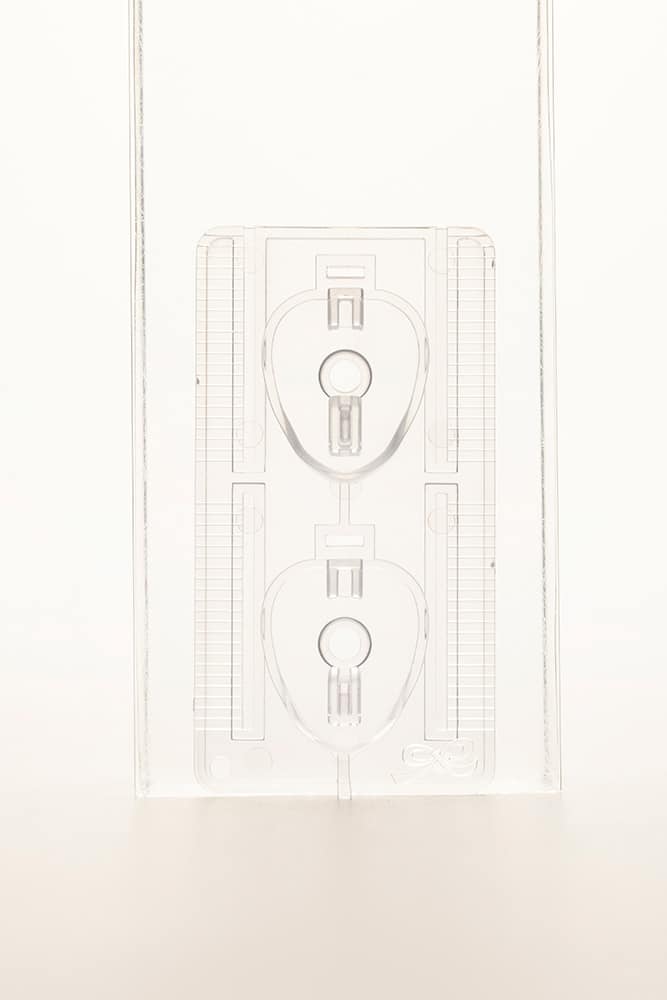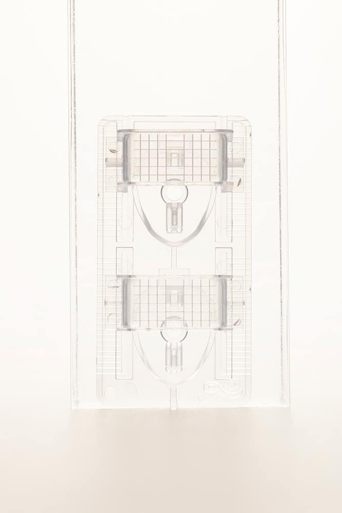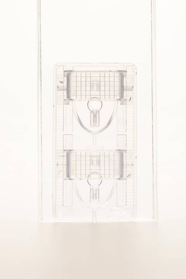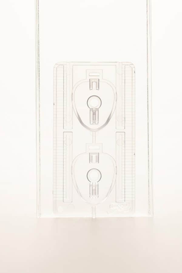 It is transparent and has a grid engraved in the center to measure the distance between the eyes, which is handy for checking the balance and height of the left and right sides.