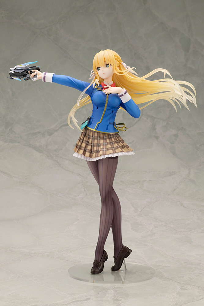 Fine details such as the electronic military device and uniform accessories have also been brought to life with great care. Her flowing blonde hair has also been dynamically sculpted to reflect the flow of movement and can be admired from all angles.